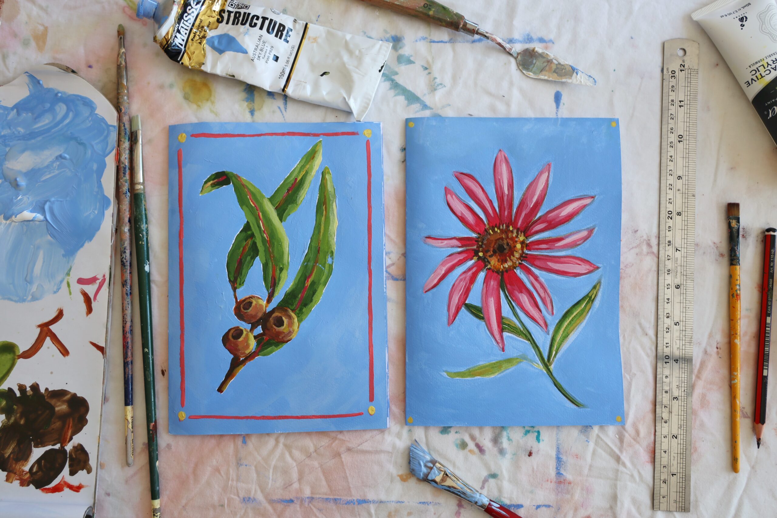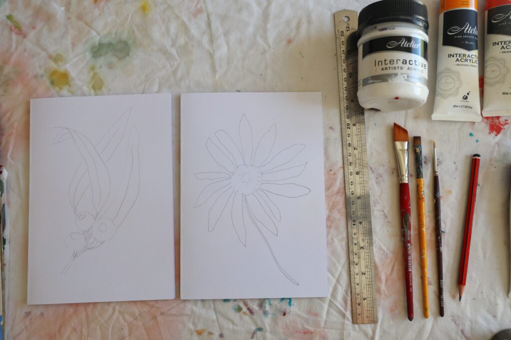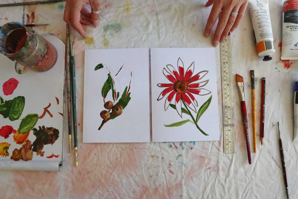 Start by painting in your green foliage or stems first. You may need to water your acrylic paint down as you go, so the brush glides over the surface of the paper and the paint goes on smoothly – almost like watercolours. Start from the centre of the flower and paint your petals outwards in a controlled, sweeping brushstroke.