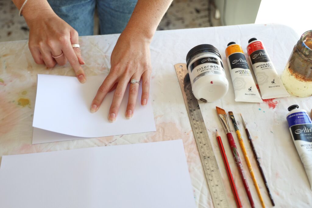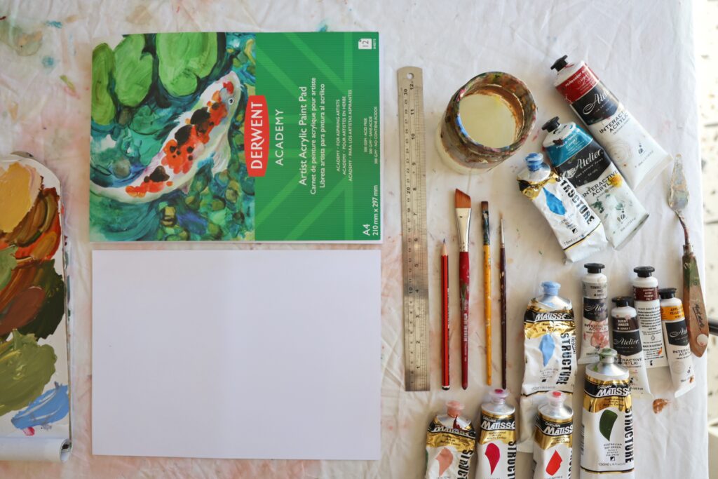 Set up a clear area to work, with fresh paint water for cleaning your brush and a cloth to wipe it on. We are using a sheet of acrylic paint paper for this project, but you can use any thicker card or water colour paper you have at home – something much thicker than normal copy paper. You can use your favourite acrylic paint colours that you think Mum will like, or stick to a simple palette of red, blue, yellow, white and brown to experiment with colour mixing!