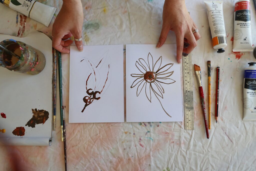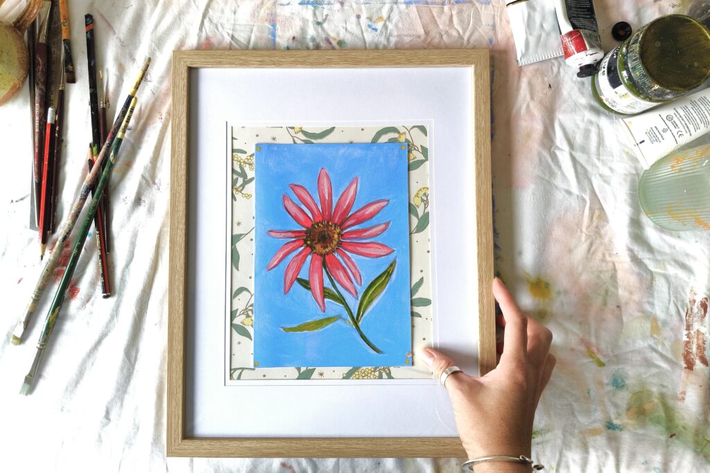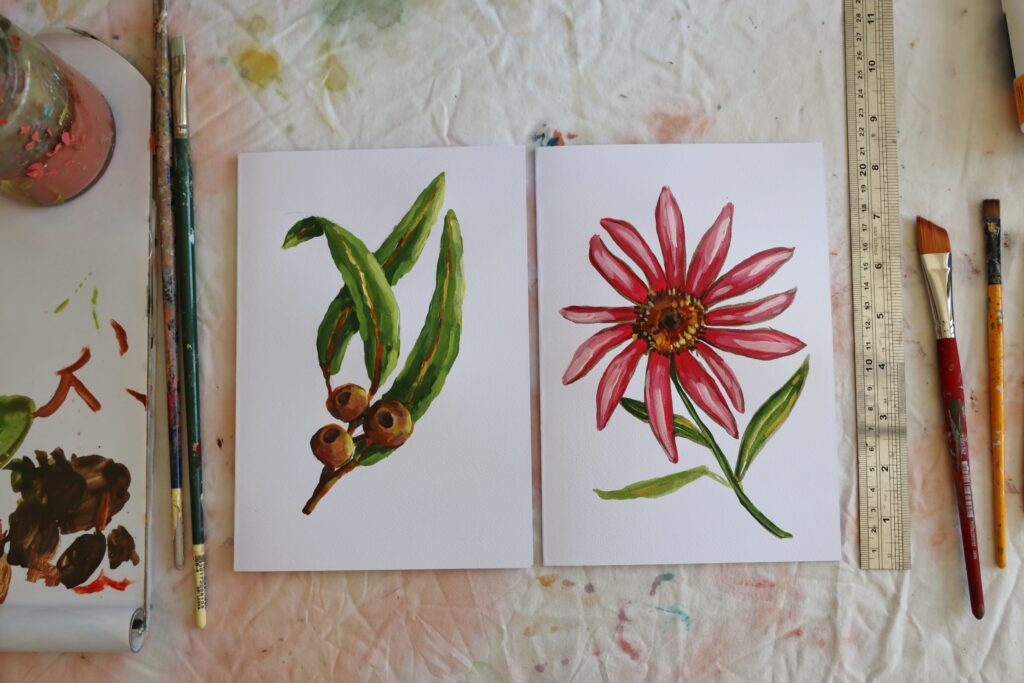 Acrylic paints layer really nicely – so this is the time to add your highlights with your smallest brush. Add some white or yellow to your green to highlight your leaves or stems. Add some white or yellow to your petal colour to highlight your flower. You can keep going with lighter and lighter layers, to really see your flower or leaves come to life! Keep adding a slight bit of water to your paint as you go, to keep it looking lovely and smooth.
