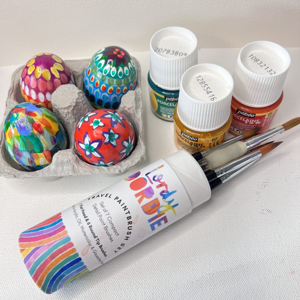 • Arrange your ceramic eggs, paints, brushes, and a small cup of water for easy access